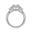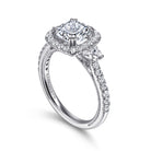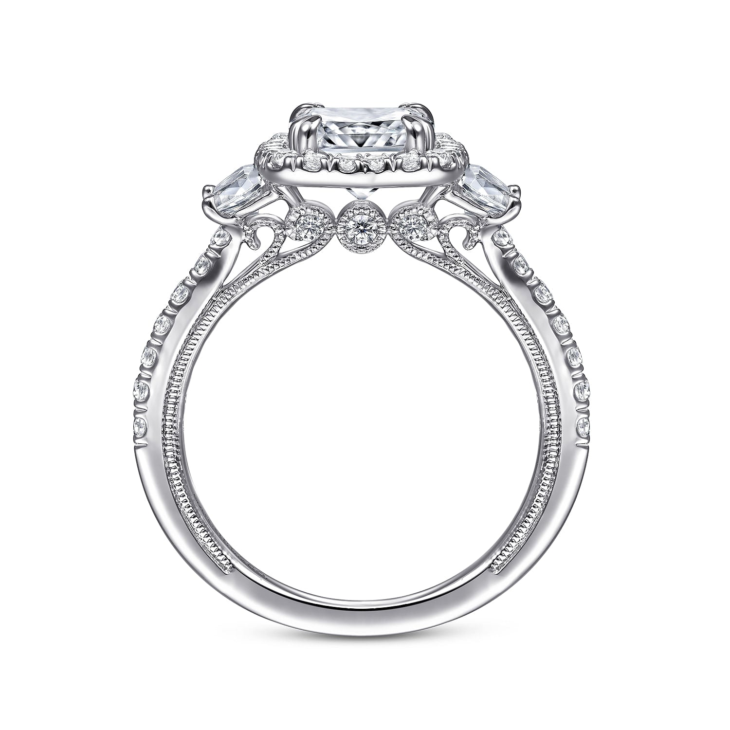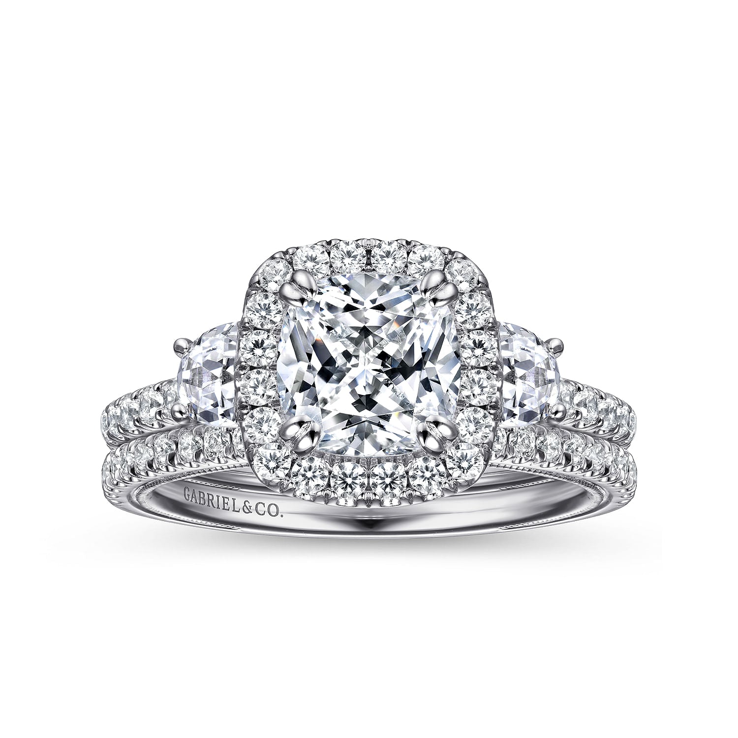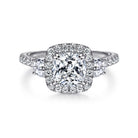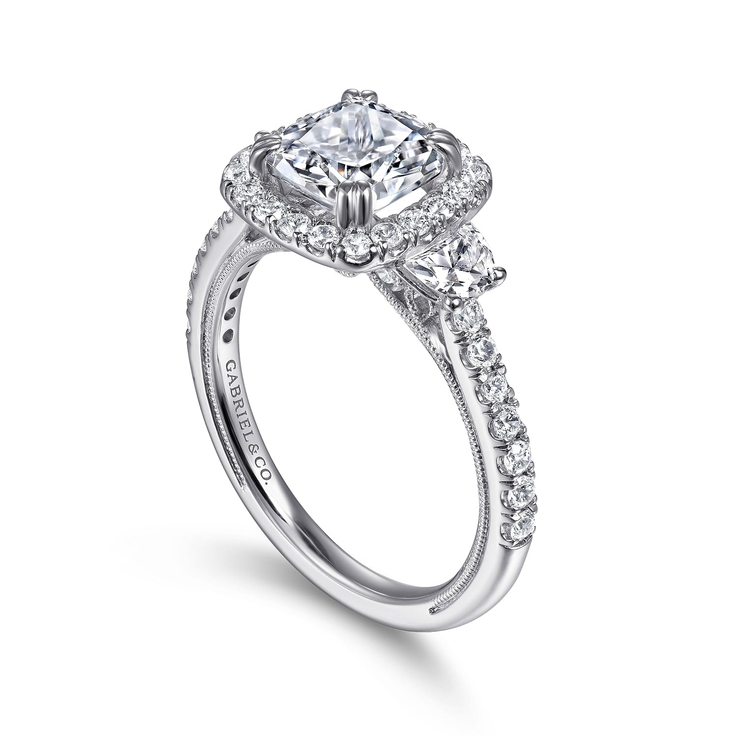 Vintage Inspired 14K White Gold Cushion Three Stone Halo Diamond Engagement Ring