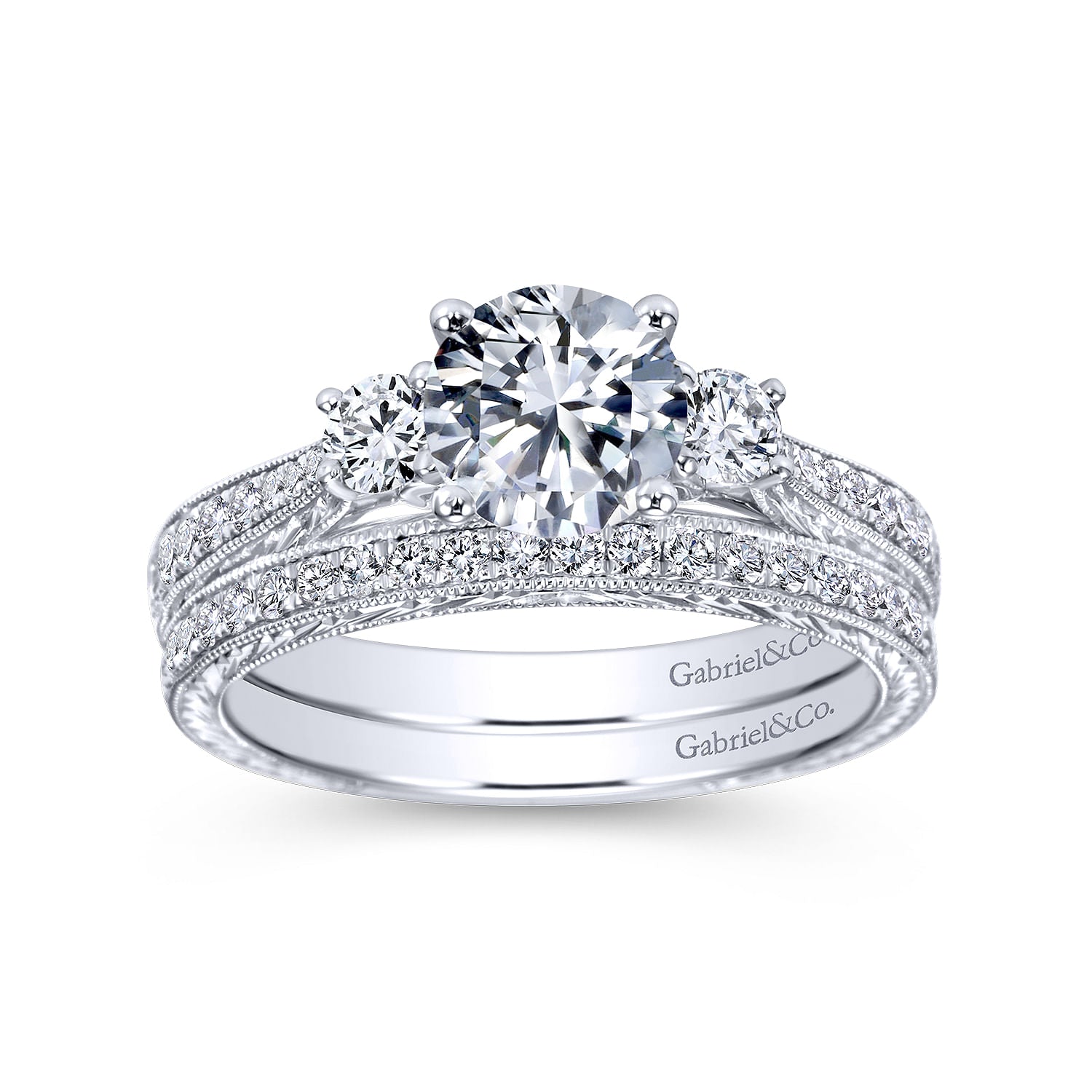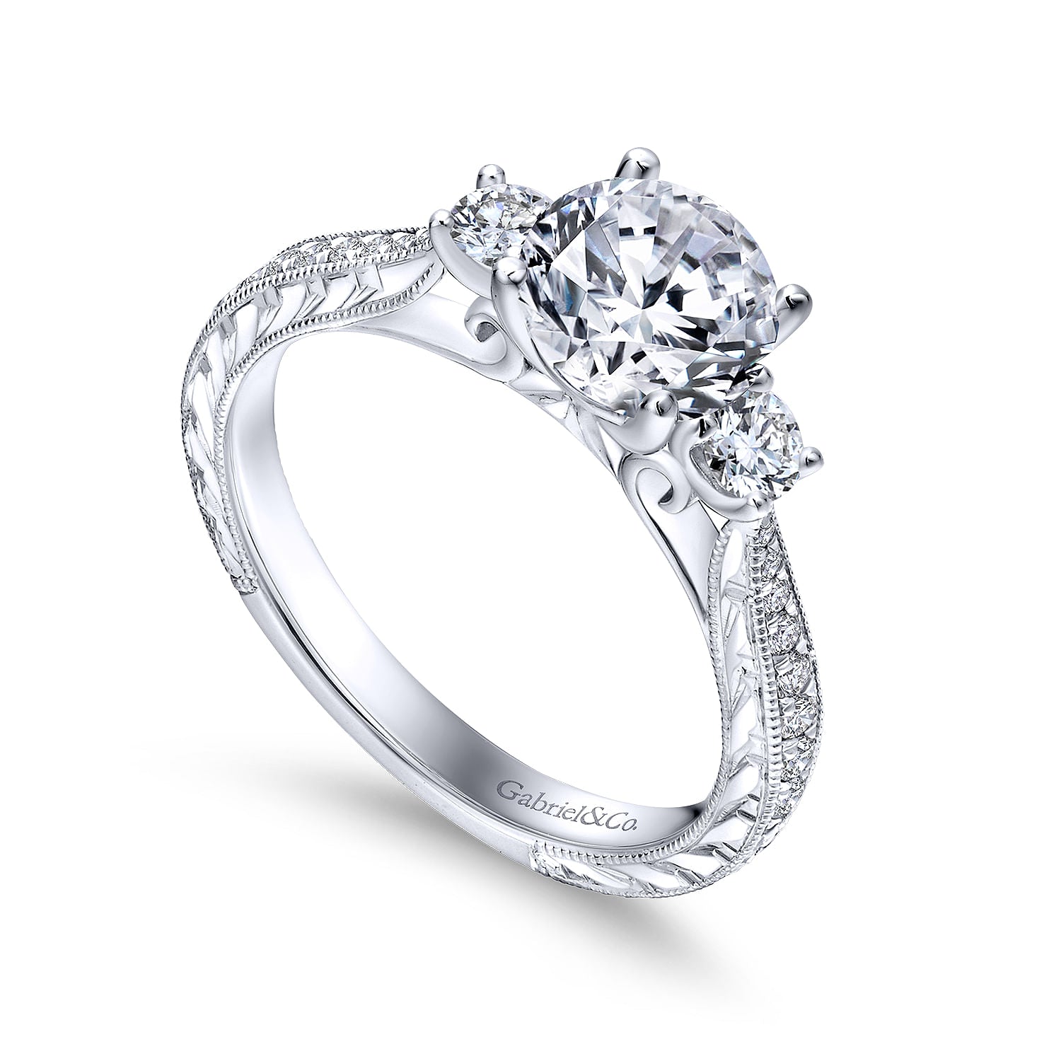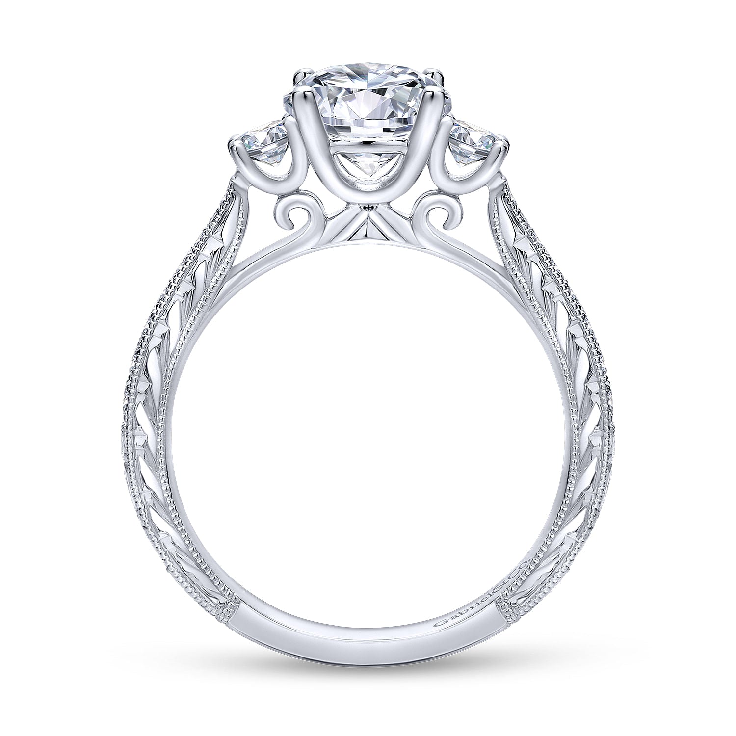 Vintage Inspired 14K White Gold Round Three Stone Diamond Engagement Ring