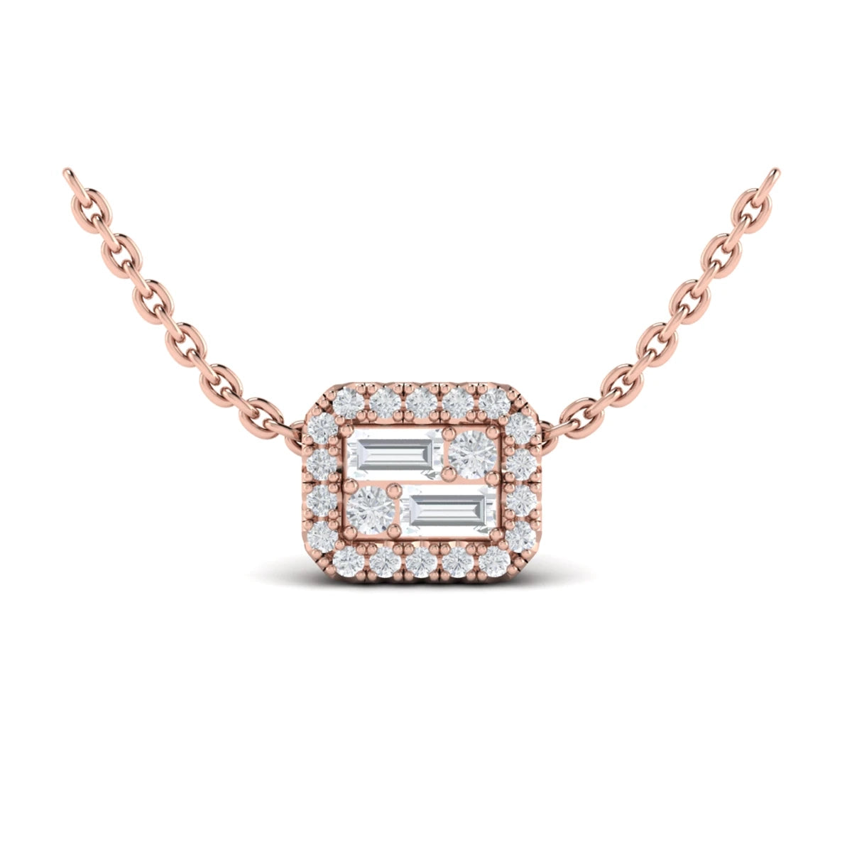 Diamond Baguette Halo Pendant Necklace Rose Gold