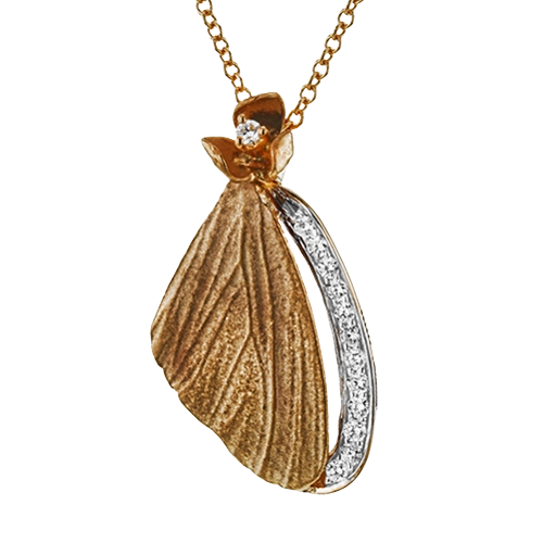 A delicate butterfly's wing crafted in rose gold is the centerpiece of this pendant, accented by a row of .11 ctw of white diamonds.