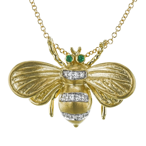 18K yellow gold Bee pendant stuns with a brushed textured finish and has 0.06 ctw of diamonds, and 0.02 ctw emeralds for eyes on an 18" chain