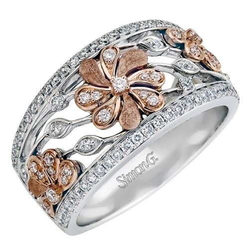 Showcasing a vintage garden floral design with a contemporary flair, this band-style ring is set with .53 ctw of sparkling round-cut white diamonds. Two rows of shimmering diamonds finish this ring.