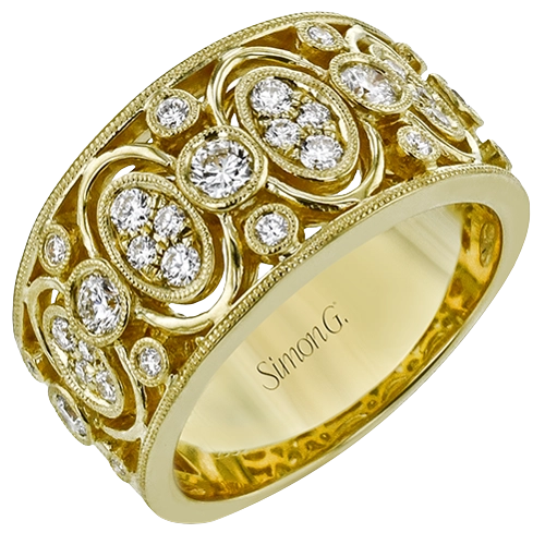 This 18K yellow gold wide right hand ring features clusters of whte diamonds 0.39ctw encircled in gold and 0.24 ctw of bezel set diamonds