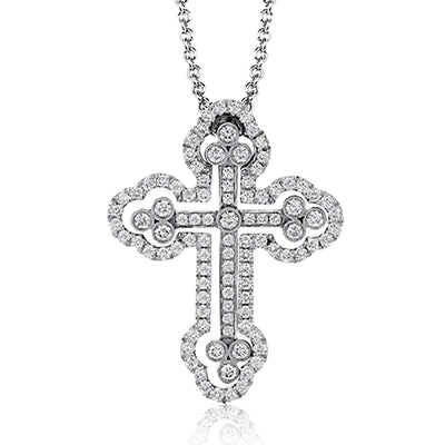 This cross pendant has a little something different to its design with a movable outline and center section, all made from 18k white gold. The pendant is set with .88 ctw of white diamonds.