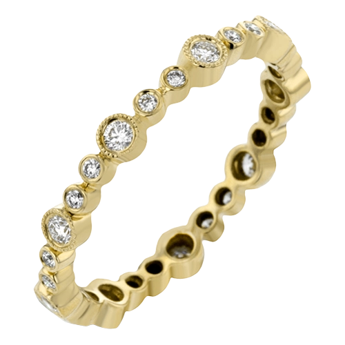 This lovely 18k yellow gold band showcases varied sizes of round white diamonds that total .30 ctw. Perfect for stacking.