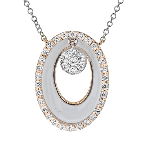 A modern circle, this 18k white and rose gold pendent features .34cttw diamonds and white enamel.