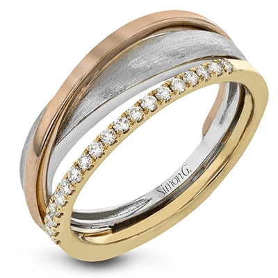 .16 ctw of round white diamonds accentuate overlapping rings of three-tone gold to infuse this strikingly modern band with a touch of sparkle