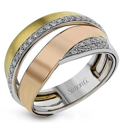 Beautiful and distinctive, this ring features overlapping bands in three-tone gold, with .20 ctw of round white diamonds shimmering from the white gold sections