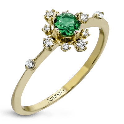 This charming 18k yellow gold ring is perfect for stacking and contains a .35 ct center tsavorite stone and .13 ctw accent diamonds.
