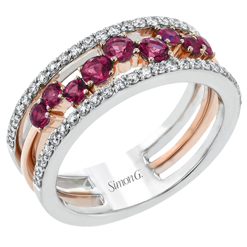 This ring features a meandering path of .65 ctw offset rubbies in it midst, flanked by .38 ctw white diamonds along the edges.