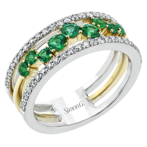 This ring features a meandering path of .49 ctw offset emeralds in it midst, flanked by .38 ctw white diamonds along the edges.