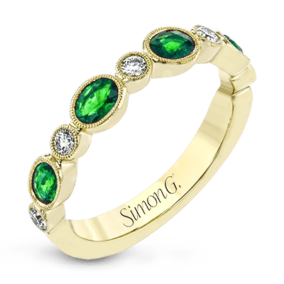 This lovely 18k yellow gold band is perfect for stacking but can also stand on its own. Beautiful green emeralds are paired with .15 ctw of diamonds.