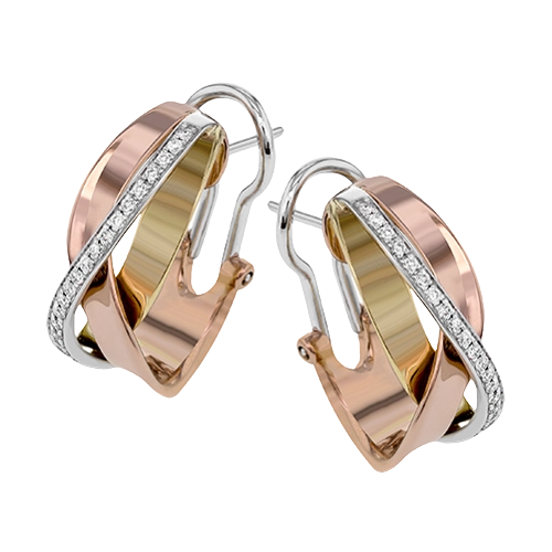 These distinctive earrings are wrought in three tones of 18k gold: white, rose, and yellow. Accenting these metals is a line of .24 ctw of white diamonds.
