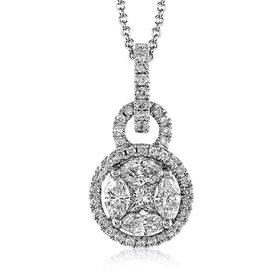 With its double circle design, this elegant white gold pendant is accented with .10 ctw princess cut white diamonds, .19 ctw round cut white diamonds, and .30 ctw marquise cut white diamonds.