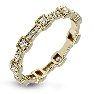 This yellow gold band form a modern style band set with .33 ctw of striking round cut white diamond accents. Perfect for stacking.