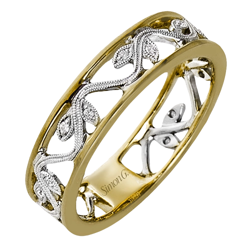An intricate floral design highlights this classic white and yellow gold ring accentuated by .04 ctw of elegant round cut white diamonds.