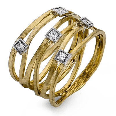 This eye-catching yellow gold ring features a lovely layered design and .09 ctw of glistening round cut white diamonds set in square-shaped white gold settings.