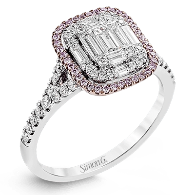 The modern style of this white gold ring is complemented by .48 ctw of glistening baguette cut white diamonds and .38 ctw of round cut white diamonds.
