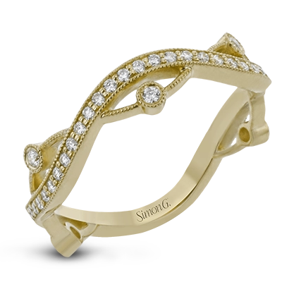 This 18k yellow gold band has a design of in intertwined lines of pave set and bezel set diamonds, which creates a distinctive look.