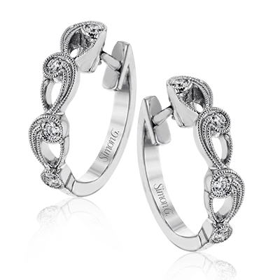 These beautiful white gold earrings feature an intricate scrolling design with .11 ctw of round white diamonds for just a hint of sparkle.