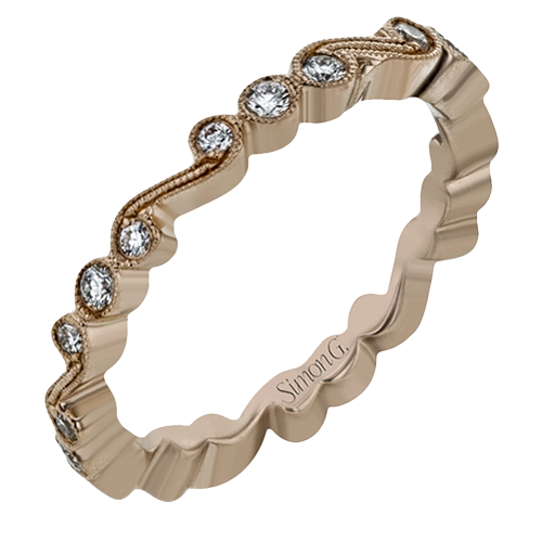 This vintage inspired 18k rose gold ring contains .12 ctw of round white diamonds in a delicate swirling design. Perfect for stacking.