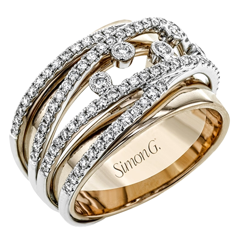 This magnificent ring glitters with .55 ctw of round white diamonds accentuating its complementary bands of white and rose gold.