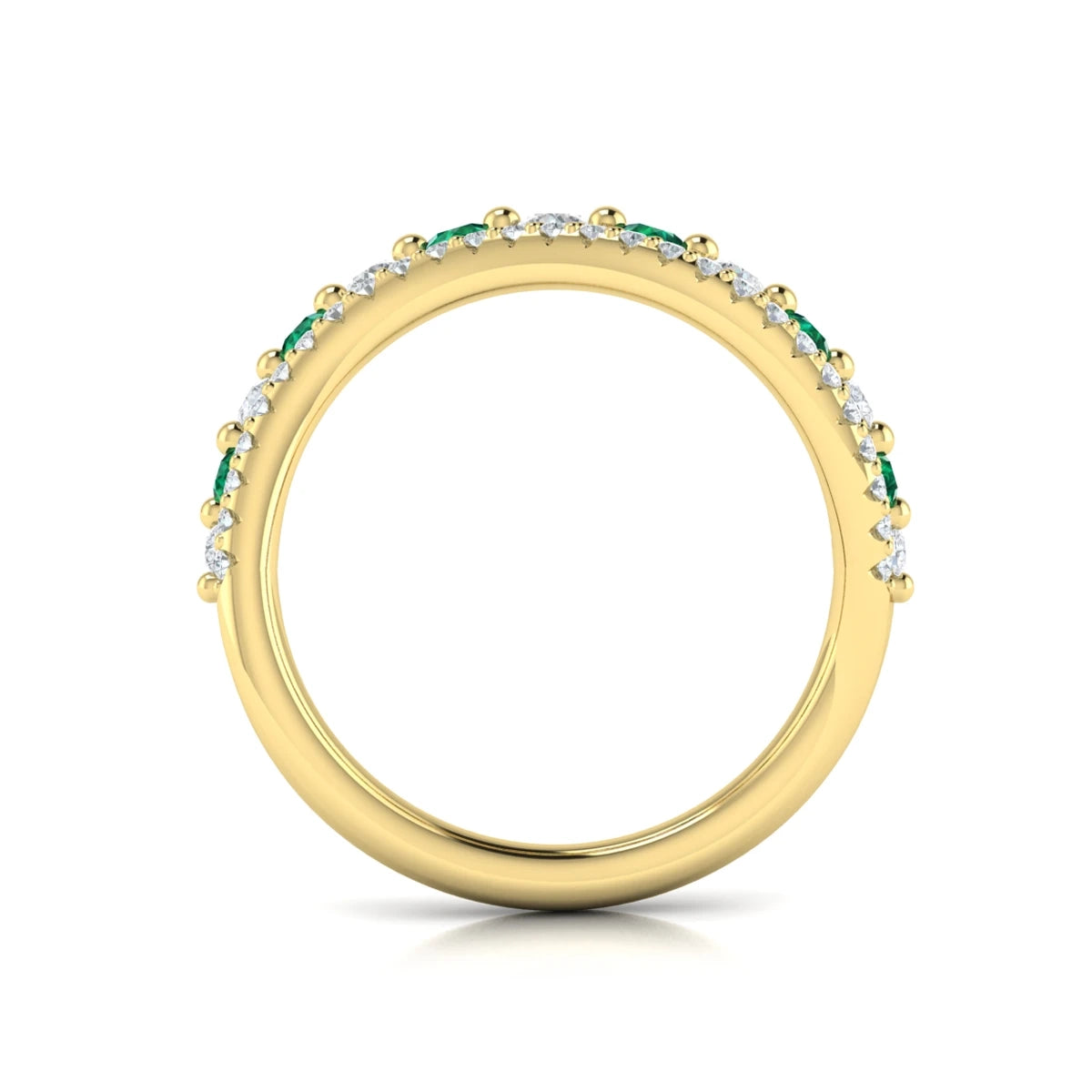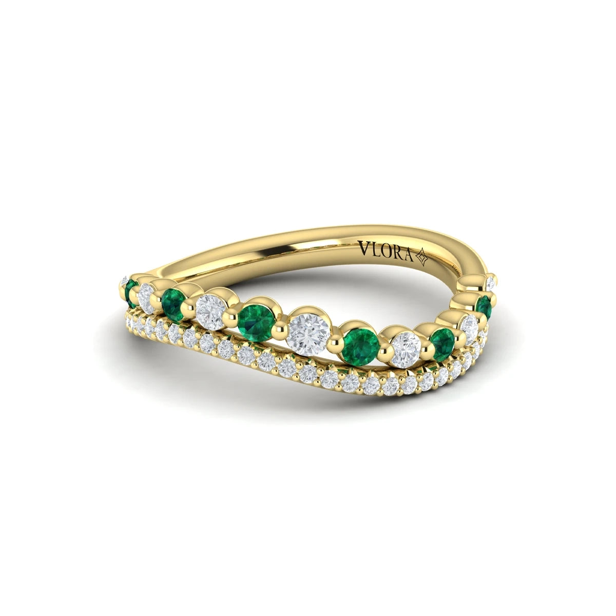 Diamond and Emerald Two Row Curved Ring Yellow Gold