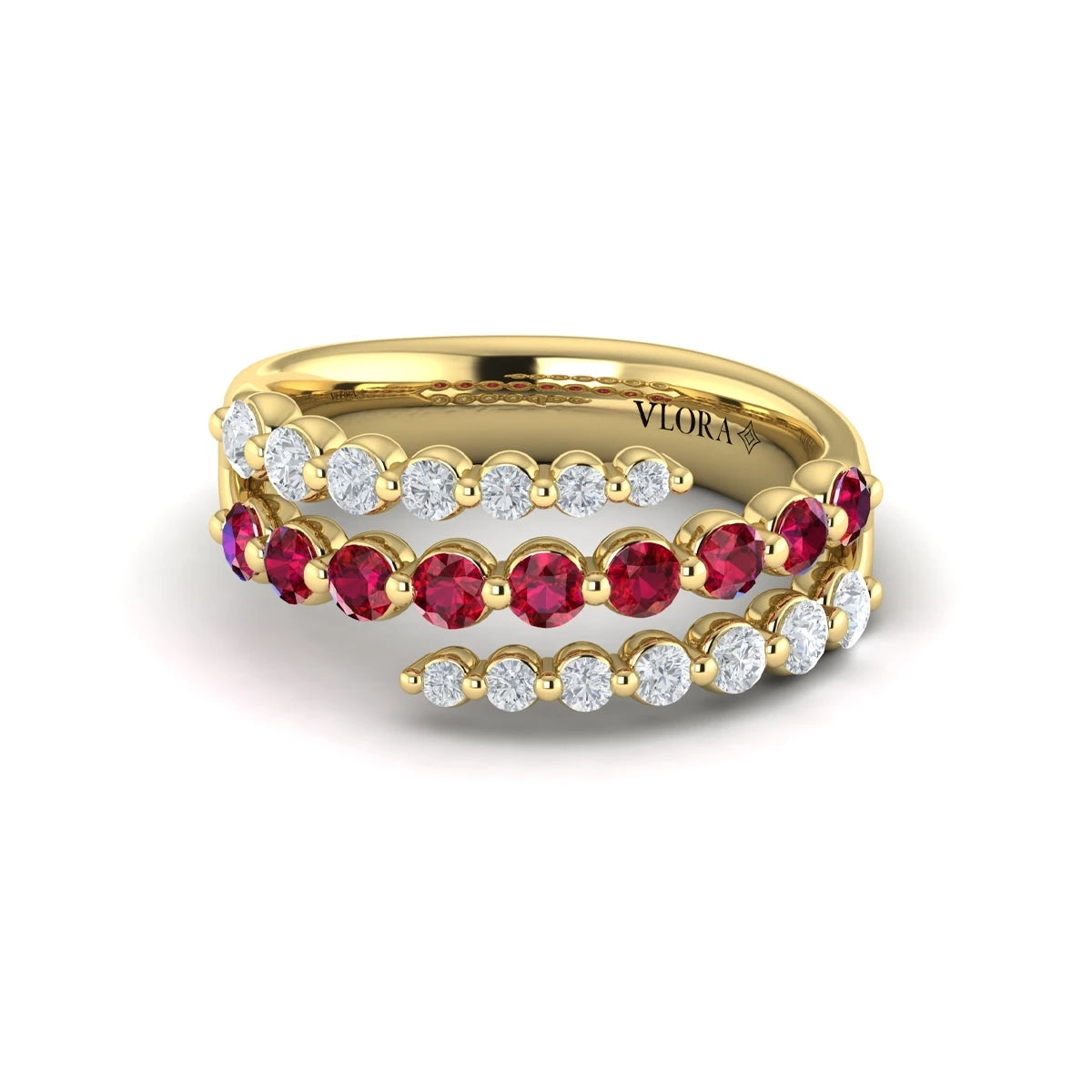 Diamond and Ruby Three Row Wrap Ring Yellow Gold