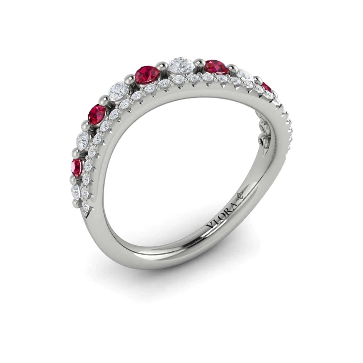 Diamond and Ruby Two Row Curved Ring White Gold