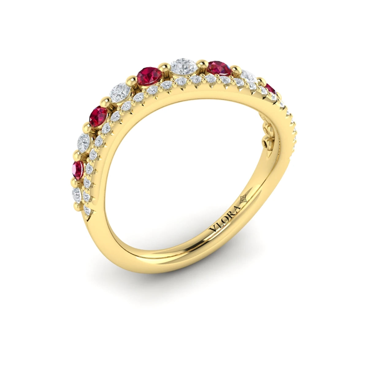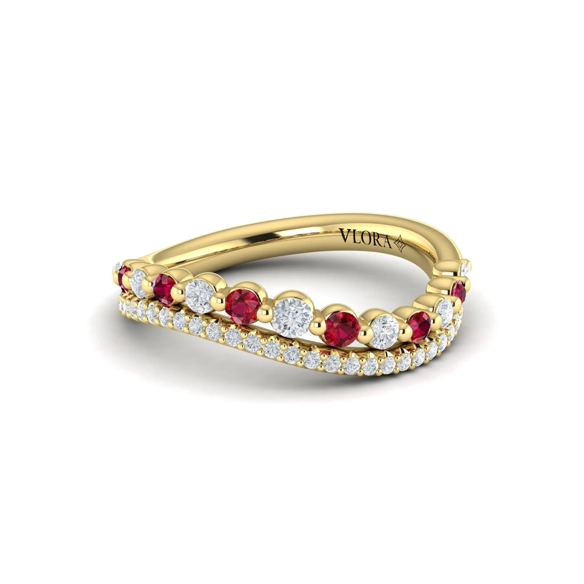 Diamond and Ruby Two Row Curved Ring Yellow Gold