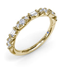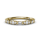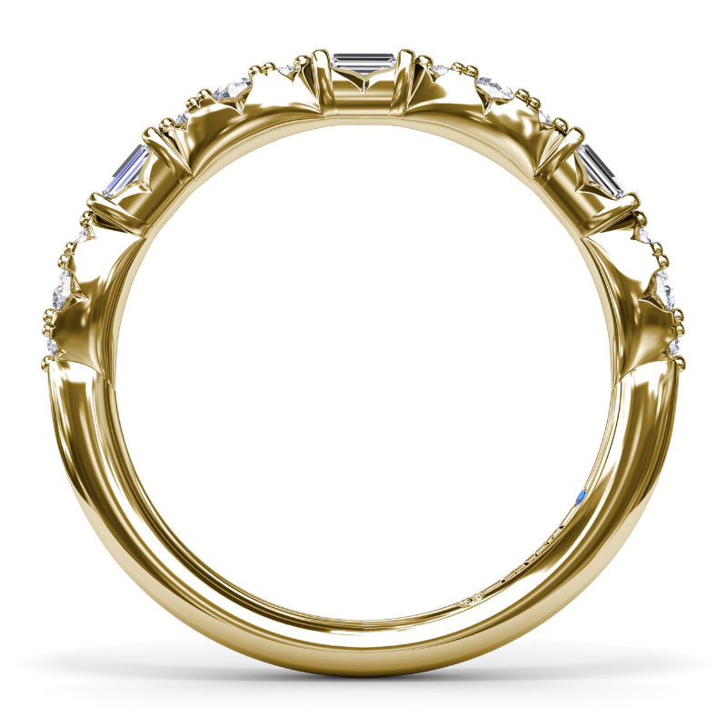 This round clusters and emerald cut diamond band is perfect for stacking. This design can be customized based on stone shape and metal preference.