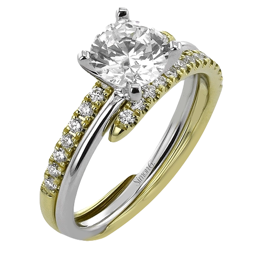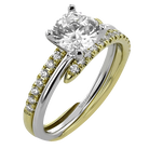 This two-tone engagement ring features a curved high polished white gold ring, complimented by an interlocking rose gold band with milgrain beading and 0.17 ctw of diamonds