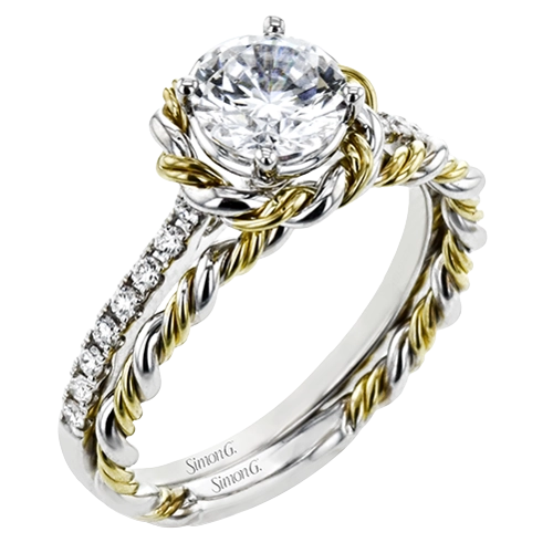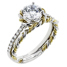 This ring is certainly a twist on a classic, with the band and halo formed from two tones of 18k gold twisted together, and the engagement ring set with .18 ctw of diamonds.