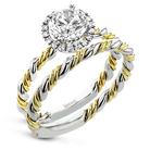 This ring is a twist on a halo engagement ring, with 18k yellow and white gold intertwining in the band.