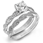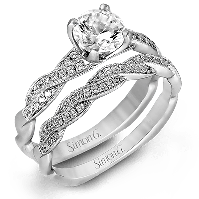 Featuring a modern design, this elegant white gold engagement ring and wedding band set are accentuated by .22 ctw of shimmering round cut white diamonds.