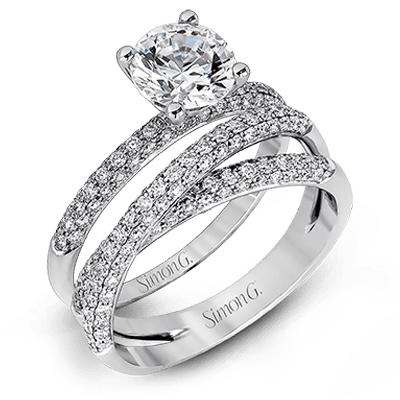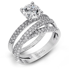 This impressive contemporary white gold engagement ring and wedding band set are emphasized by 1.00 ctw of dazzling round cut white diamonds.