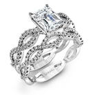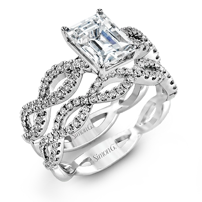 The intricate twisted design of this modern white gold engagement ring and wedding band set is set with .65 ctw of striking round cut white diamonds.