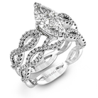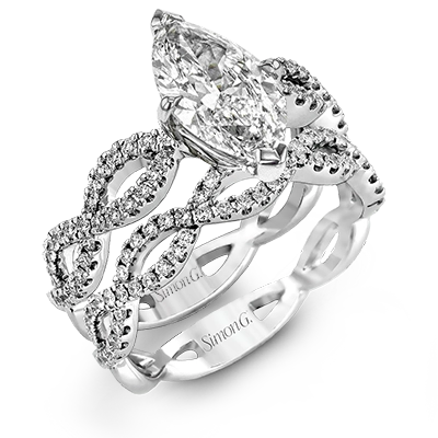 The intricate twisted design of this modern white gold engagement ring and wedding band set is set with .65 ctw of striking round cut white diamonds.
