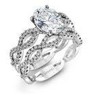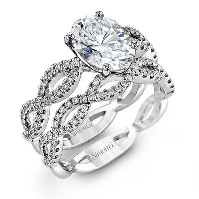 The intricate twisted design of this modern white gold engagement ring and wedding band set is set with .65 ctw of striking round cut white diamonds.