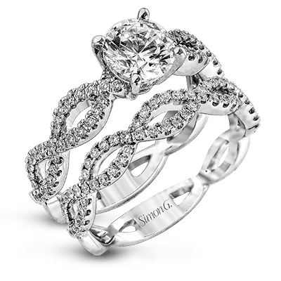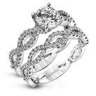 The intricate twisted design of this modern white gold engagement ring and wedding band set is set with .65 ctw of striking round cut white diamonds.