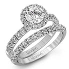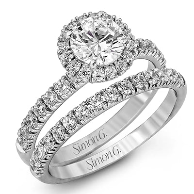 The classic halo design of this white gold engagement ring and wedding band are elevated by .80 ctw of shimmering round cut white diamonds.