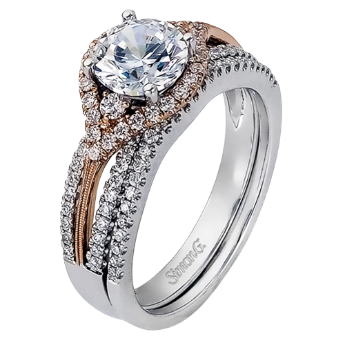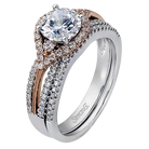 Featuring a modern design, this rose and white gold engagement ring and wedding band is highlighted by .51 ctw of round cut white diamonds.