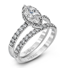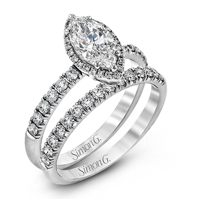 This elegant classic white gold halo engagement ring and band is set with .78 ctw of sparkling round cut white diamonds.