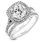 This remarkable white gold engagement ring and wedding band set features a contemporary setting with an eye-catching halo highlighted by .67 ctw of round cut white diamonds.