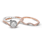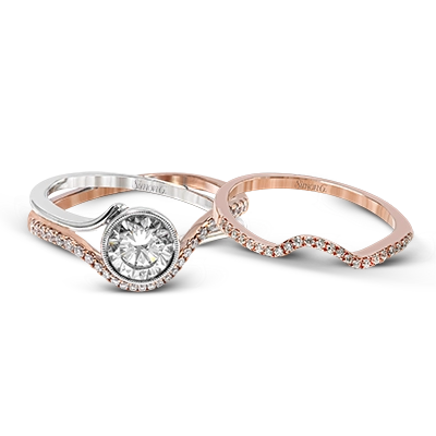 This modern wedding set is a bold choice with a crisscrossing design of 18k white and rose gold set with .26 ctw of white diamonds.