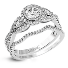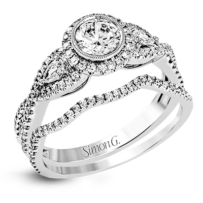 This 18k white gold wedding set has a distinctive design with a milgrain accented bezel center stone setting, .15 ctw pear side stones, and .50 ctw of round brilliant diamonds.