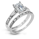 This dazzling white gold wedding set is enhanced by .21 ctw round cut white diamonds with side accents of .53 ctw of baguette cut diamonds.