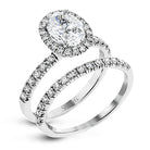 This is a classic halo design wedding set made for an oval center stone contains .72 ctw of white diamonds.