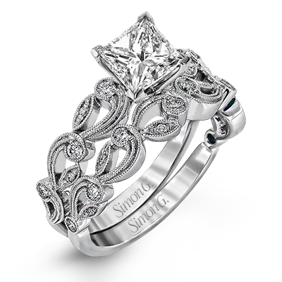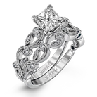 This delicate floral inspired white gold engagement ring and wedding band set is accentuated with .28 ctw shimmering round cut white diamonds.