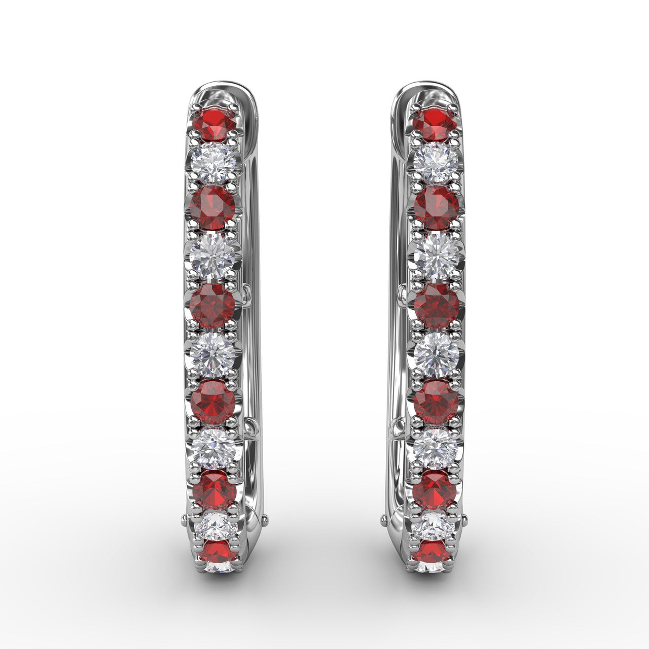 These alternating shared prong setting ruby and diamond earrings come in a variety of material types like 14k white gold, yellow gold, rose gold and can be customized. Fana diamond earrings are perfect for that special woman in your life.